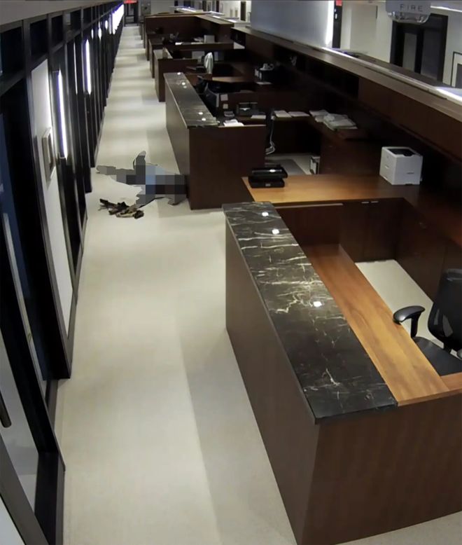 “整理”完一楼,枪手并没有就此罢手,他走向电梯,向躲在办公桌后边的安保人员开了一枪。